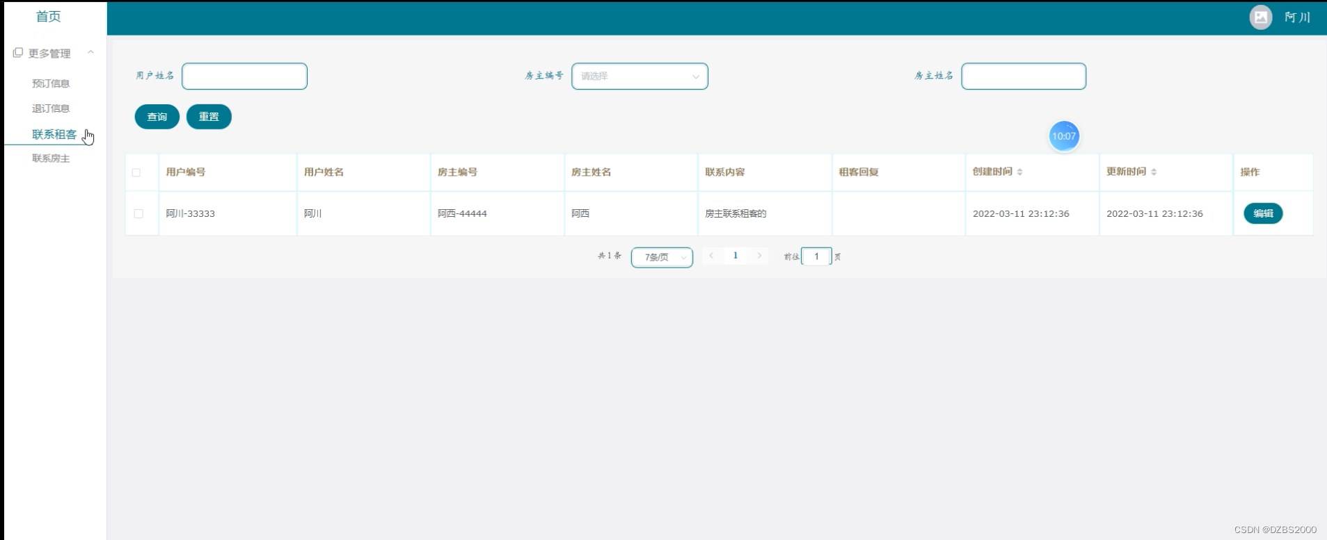 联系租客管理,在联系租客管理页面中可以用户编号、用户姓名、房主编号、房主姓名、联系内容、租客回复等信息,还可进行编辑等操作,如图5-9所示。