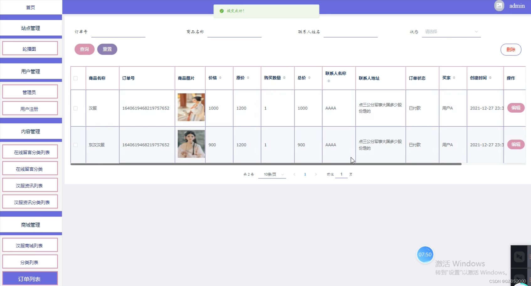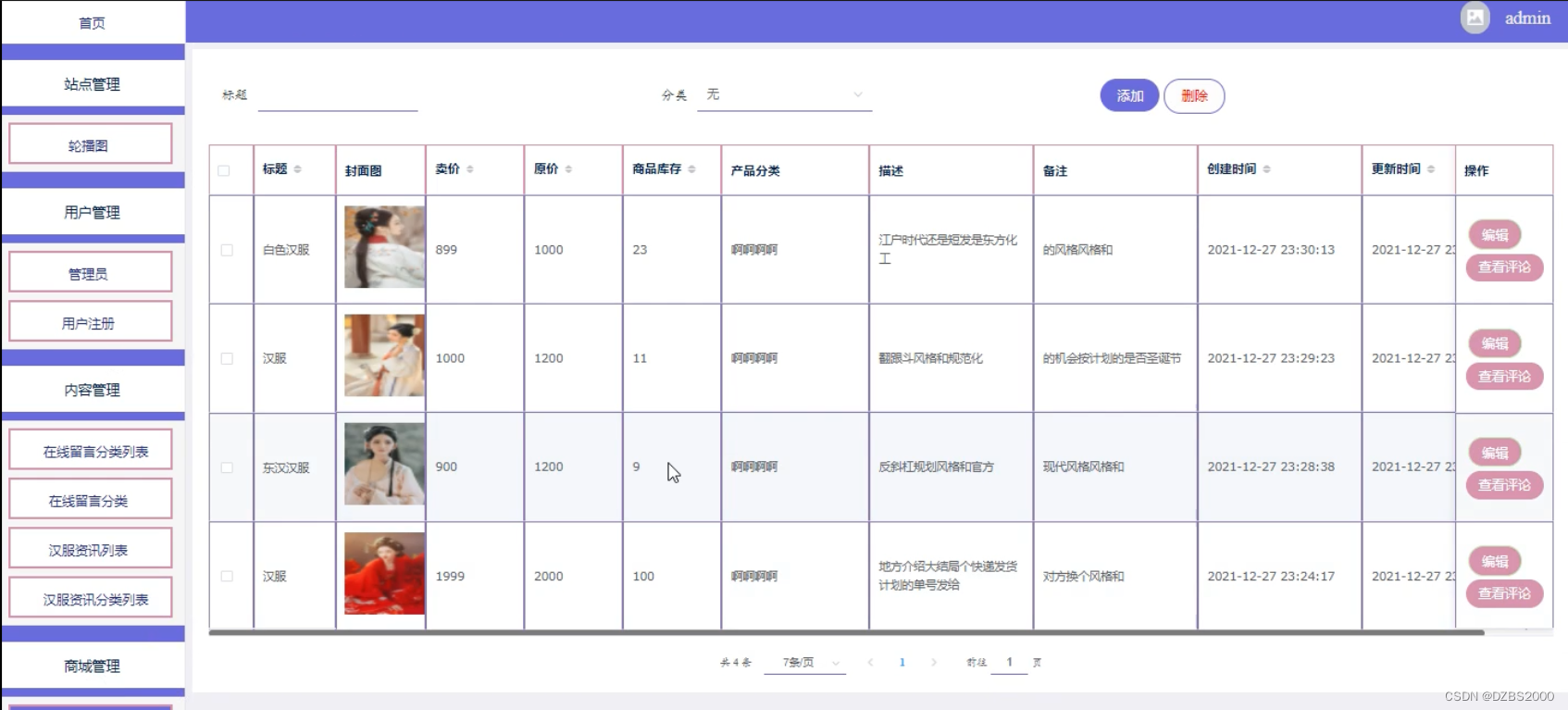 此页面的关键是汉服商城列表信息,包括标题、封面图、卖价、原价、商品库存、产品分类、描述、备注,详情等。单击提交按钮以完成信息的添加。如果未写入完整的汉服信息,例如,如果未写入汉服编号,系统将给出相应的错误提示,并且无法成功输入。数据以概念的形式以onsubmit =“return checkForm()”的形式写入以进行检查,checkForm()函数是一种用于写入数据的不同类型的校对方法,是不是为空也是经过form表单中的onsubmit=”return checkForm()来检查。