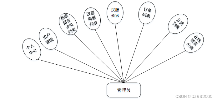 基于汉服文化交流平台的设计基于现有的电脑,可以实现管理员,用户管理、在线留言分类列表、汉服资讯列表、汉服资讯分类列表、订单列表、汉服商城列表、分类列表、在线留言分类等详细的了解及统计分析。根据系统功能需求建立的模块关系图如下图: