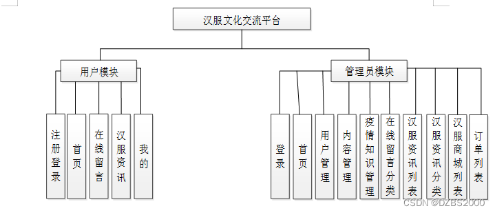 这些功能可以充分满足汉服文化交流平台的需求。此系统功能较为全面如下图系统功能结构如图4-5所示。