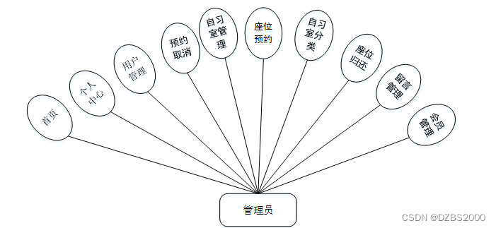 基于自习室管理系统 小程序的设计基于现有的手机,可以实现管理员:首页、自习室管理、座位预约、自习室分类、预约取消、座位归还、留言管理、会员管理等详细的了解及统计分析。根据系统功能需求建立的模块关系图如下图: