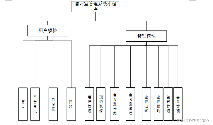 这些功能可以充分满足自习室管理系统小程序的需求。此系统功能较为全面如下图系统功能结构如图4-5所示。