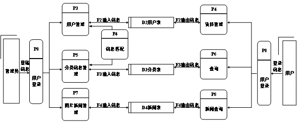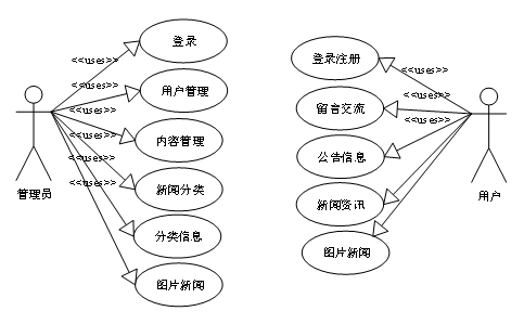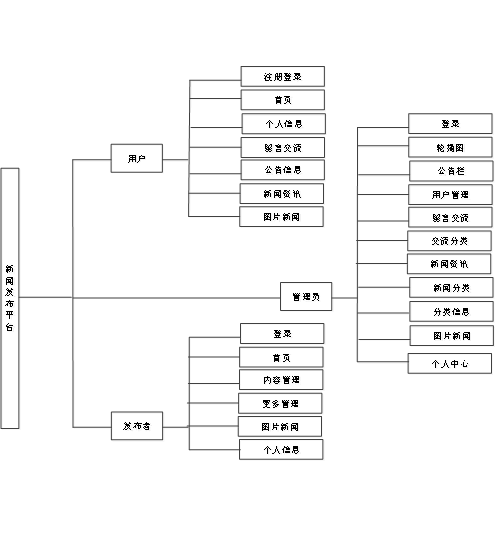 新闻发布平台的功能主要分为前台用户根据自己的需求进行注册登录,浏览新闻信息并对选中的新闻进行搜索操作。后台系统管理员因职责的不同,管理员主要对注册用户,新闻数据,新闻评论进行处理。