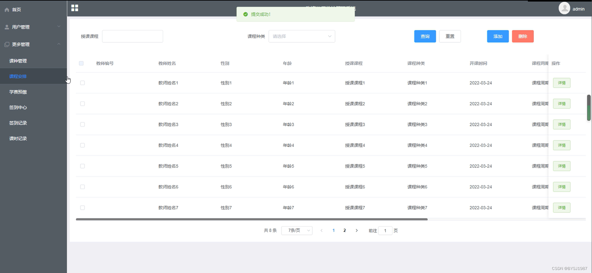 课程安排,在课程安排页面图可以对教师编号、教师姓名、性别、年龄、授课课程、课程种类、开课时间等,并可在课程安排查询页面对已有的会议信息进行编辑、删除、详细等操作,如图5-5所示: