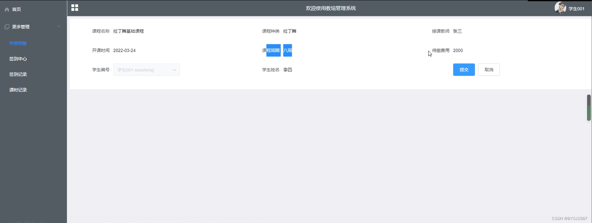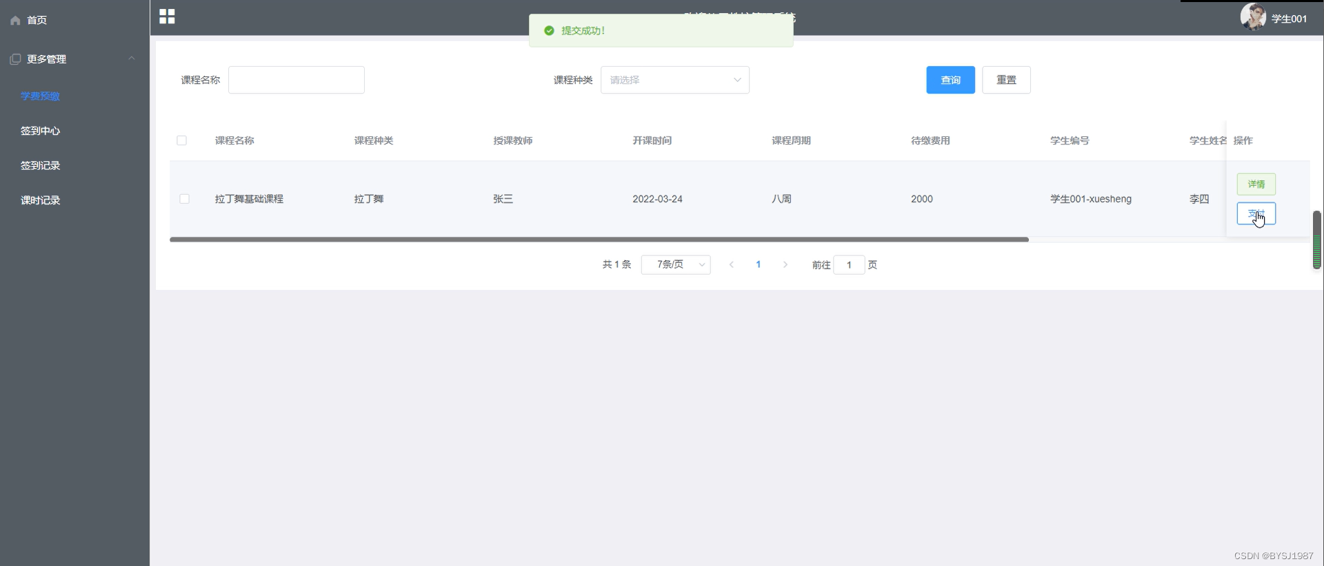 学费预缴,在学费预缴页面可以查看课程名称、课程种类、授课教师、开课时间、等信息,如图5-10所示。