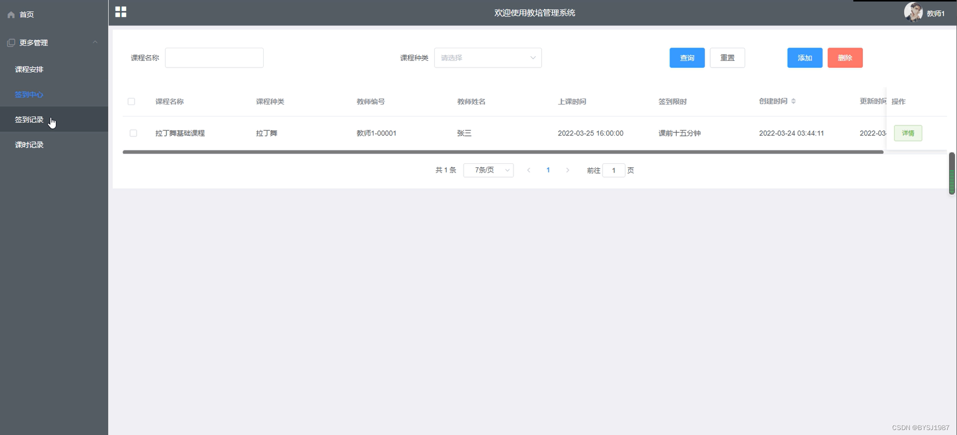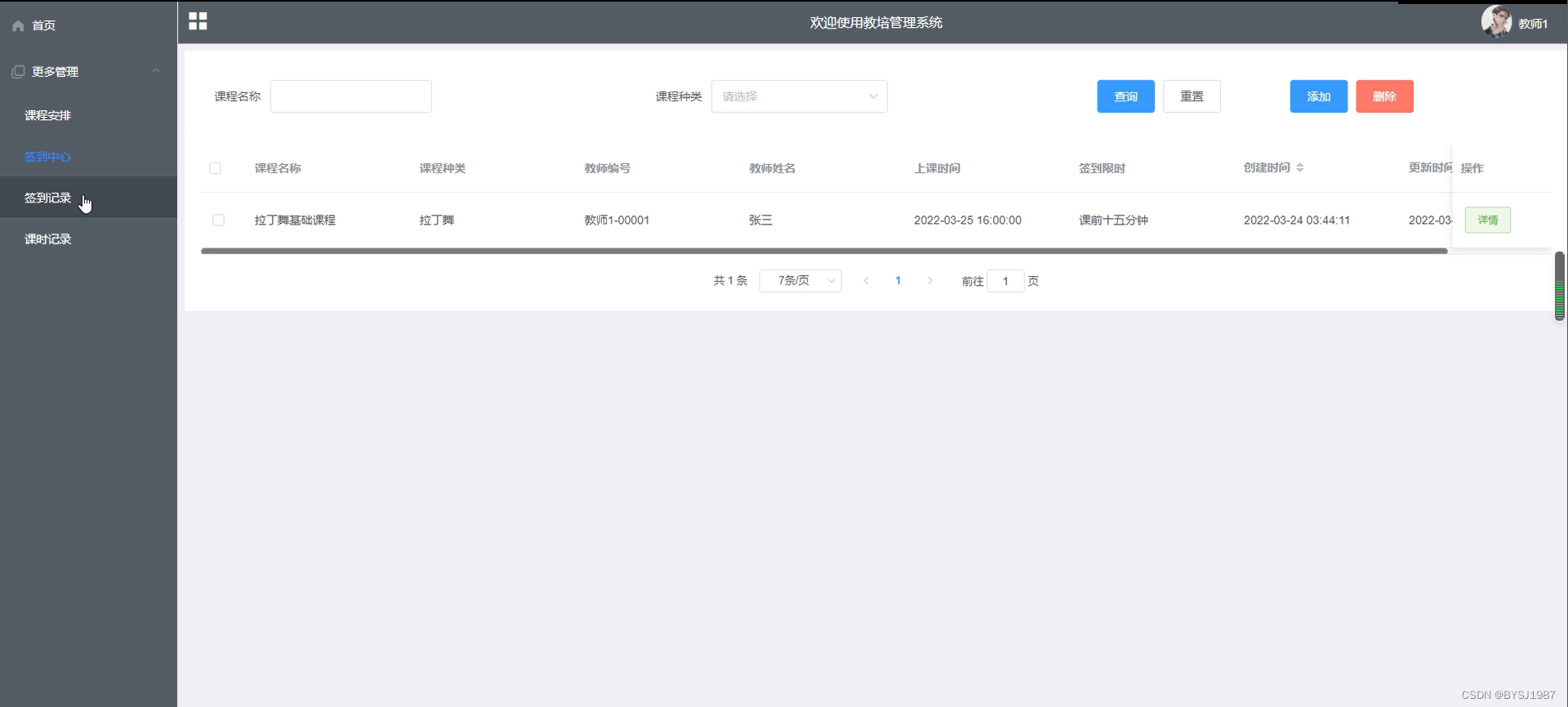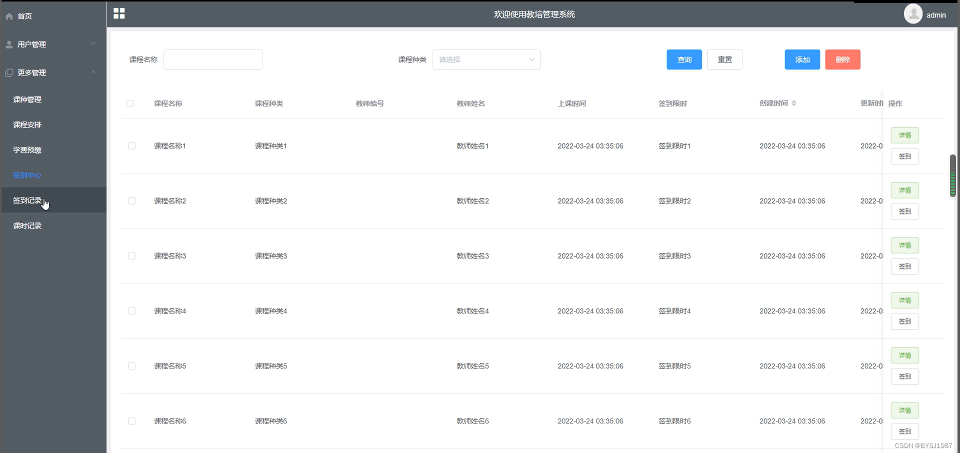 签到中心管理,在签到中心管理查询页面可以查看:课程名称、课程种类、教师编号、教师姓名、上课时间、签到时间等内容,并可在该页面进行编辑删除详情等操作,如图5-6所示: