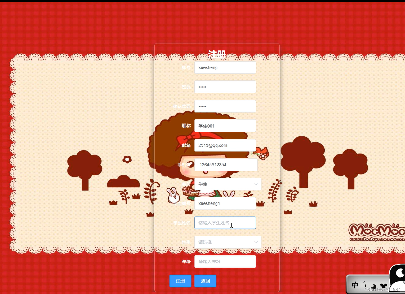 在系统首页注册,学生在前台页面注册信息:用户名、密码、姓名、性别、出生年月、邮箱、手机、身份证、头像、地址、备注等内容,如图5-8所示: