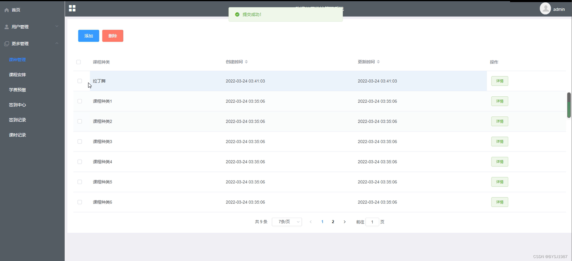 课种管理,在课种管理页面可以查看课程种类、创建时间等信息,并可在课程种类页面进行编辑删除详细等操作,如图5-3所示。
