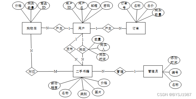 在图中,用户购买商品,关系为1:N,用户对二手书籍的管理,包括价格、数量等,关系为1:N,用户将要买的二手书籍加入购物车,关系为1:1,用户拥有自己的订单,关系为1:N。
