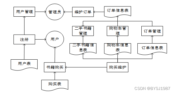 业务流程图(TFD)通过一些特定的符号描述业务的处理过程,它重点强调业务过程中每一项处理活动和具体业务部门的关系,选择部分模块进行具体描述。重点对本系统整体业务中最为主要的二手书籍交易及订单业务进行描述,用户进入校园二手书籍交易平台后进行各种模块信息的浏览,选择想要购买的书籍添加到购物车,用户到购物车进行所购书籍查询并确认购买、填写订单信息,另外,管理人员进入后端管理,以执行该订单信息控制模块的相关管理方法,并在解决后向客户提供反馈机制。