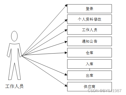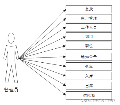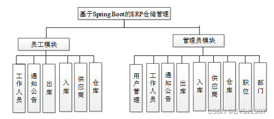 ERP仓储管理信息系统在对需求做解析后,整个系统主要分为两个部分:管理员和员工、仓管员,每个模块下的分支功能不一样。对功能做出如下说明: