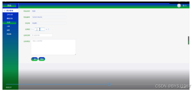 工作人员出库,填写物品名称、物品编号、供应商、出库数、出库日期、出库原因提交信息操作。物品出库提交界面如图所示。