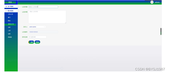 管理员填写公告标题、公告详情、发布人、公告编号、发布日期提交信息如图所示。