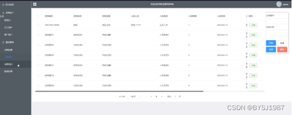 (4)入库信息:点击“入库信息”这个按钮可以查看到所有入库信息,支持通过货物编号或者货物名称或者入库人员进行查询入库信息,可以对入库信息信息进行添加、删除、查看入库信息的详细内容;