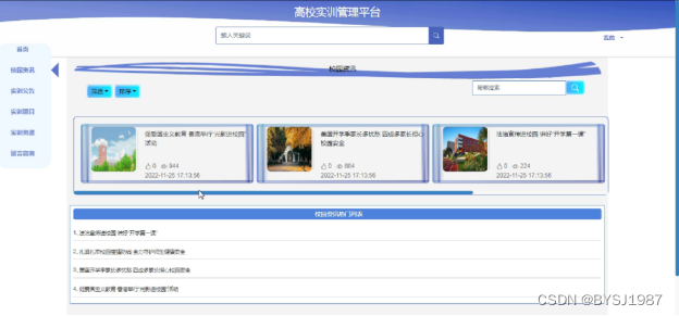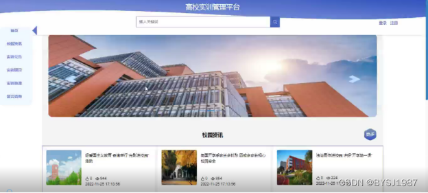 (2)查看高校实训管理平台的首页信息:高校实训管理平台的首页信息包含了首页、实训公告、校园资讯、实训项目、实训资源、留言咨询等。