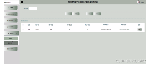 基于大数据技术的创业推荐系统 是个现代化的高度集成的综合信息系统,系统主要服务对象为用户,最大化在页面中提供多的信息,因此在系统维护上,数据量较大,整体的维护设计如下: