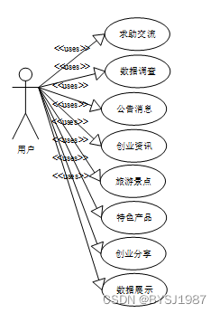 系统设计的目的是分析系统包括的所有功能结构,为开发人员设计开发和实现系统做好准备工作。经过前期的需求调查、分析和整理之后,确定的总体需求主要包括多个模块,分别是:求助交流、数据调查、公告消息、创业资讯、旅游景点、特色产品、创业分享、数据展示。系统整体角色分为二个部分,一是用户、最后是管理员。权限分布也是很明显,用户是在除去浏览信息之外还具有查询和管理自己首页、求助交流、数据调查、公告消息、创业资讯、旅游景点、特色产品、创业分享、数据展示等权限;管理员是最高权限拥有者。