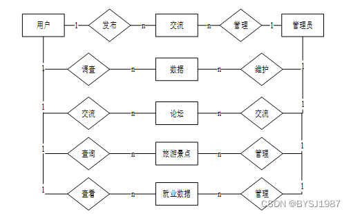 对于一个要开发的系统来说,E-R图可以让别人能更快更轻松的了解此系统的事务及它们之间的关系。根据系统分析阶段所得出的结论确定了在基于大数据技术的创业推荐系统 中存在着多个实体分别是用户、管理员、交流、就业数据。