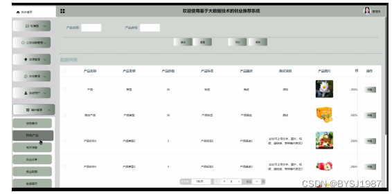 This design mainly implements a business recommendation system based on big data technology that combines the advantages of humanization, efficiency, and convenience, and completes the rotation chart, announcement message Resource management (entrepreneurship information, information classification, data survey) System user (administrator, ordinary user) module management (homepage, help exchange, announcement message, entrepreneurship information, tourist attractions, featured products, entrepreneurship sharing, employment data, data display) and other functional modules. The system communicates with the server through a browser to achieve data interaction and change. This system improves work efficiency and reduces errors and omissions in data storage through scientific management methods and convenient services. The entrepreneurship recommendation system based on big data technology uses Java language, uses SSM technology based on MVC mode for development, and uses MyEclipse 2017 CI 10 compiler for writing. In terms of data, it mainly uses Microsoft's MySQL relational database as the data storage medium, and cooperates with the previous HTML+CSS technology to complete the system development.