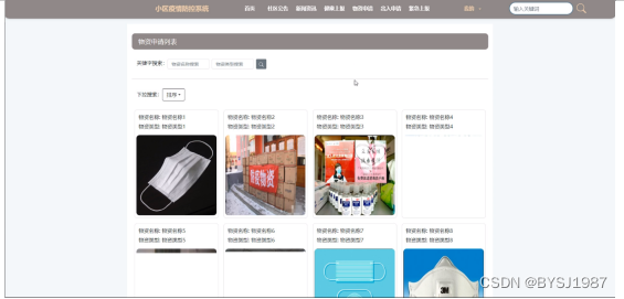 物资申请列表,在物资申请列表页面可以查看物资编号、物资名称、物资类型、物资数量、物资详情等信息进行申请、点赞、收藏等信息操作,如图5-4所示。