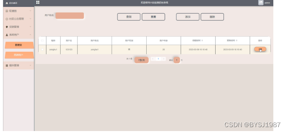 用户管理,在用户管理页面可以查看等索引、用户账号、密码、用户姓名、性别、年龄、联系电话、电子邮箱、身份证号、等信息,并可根据需要进行修改或删除等操作,如图5-7所示。