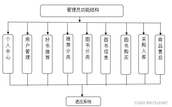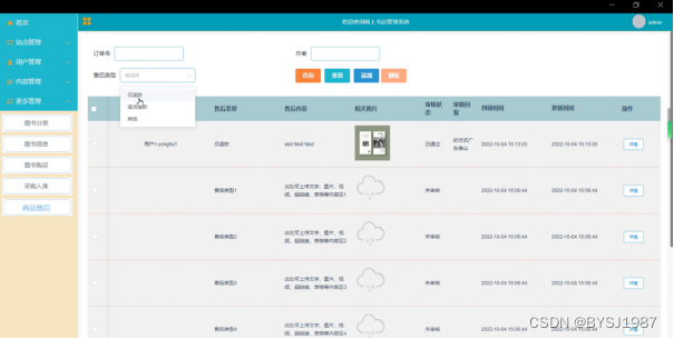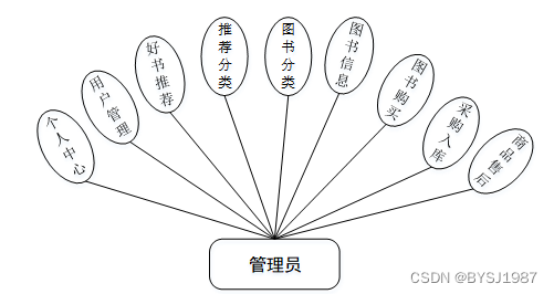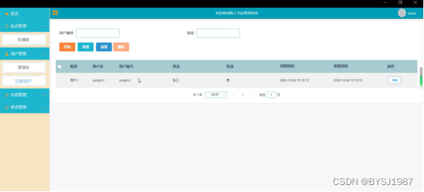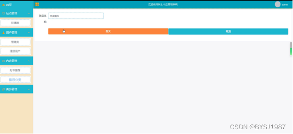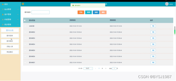 管理员功能模块包括:首页、站点管理(轮播图)用户管理(管理员、注册用户)内容管理(好书推荐、推荐分类)更多管理(图书分类、图书信息、图书购买、采购入库、商品售后)等模块。