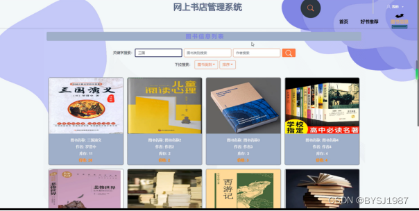 The online bookstore management system adopts B/S structure, java development language, MySQL database and other technologies. The system is mainly divided into two parts: administrator and user. The main functions of administrator management include: home page, site management (carousel map), user management (administrator, registered user), content management (good book recommendation, recommended classification), more management (book classification, book information, book purchase, purchase warehousing, commodity after-sales), etc. The user's personal background management mainly includes: home page, book purchase, commodity after-sales and other functions, basically realizing the process of information management of the entire online bookstore management system. Based on the general online bookstore management system, this system adds the function of home page pushing the latest information to facilitate users' quick browsing. It is an efficient, dynamic and interactive online bookstore management system.