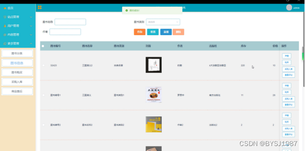 网上书店管理系统采用B/S结构、java开发语言、以及Mysql数据库等技术。系统主要分为管理员和用户两部分,管理员管理主要功能包括:首页、站点管理(轮播图)用户管理(管理员、注册用户)内容管理(好书推荐、推荐分类)更多管理(图书分类、图书信息、图书购买、采购入库、商品售后)等。用户个人后台管理主要包括:首页、图书购买、商品售后等功能,基本上实现了整个网上书店管理系统信息管理的过程。本系统在一般网上书店管理系统的基础上增加了首页推送最新信息的功能方便用户快速浏览,是一个高效的、动态的、交互友好的网上书店管理系统。