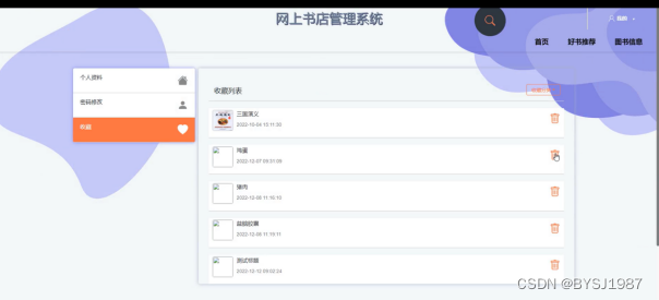 本系统设计的是一个网上书店管理系统的网站,此网站使用户实现了不需出门就可以在电脑前进行网上查看个人中心、留言板管理、我的收藏管理、订单管理等。不需亲临现场就可以在网站的图片上领略书籍信息。