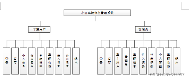 系统架构图属于系统设计阶段,系统架构图只是这个阶段一个产物,系统的总体架构决定了整个系统的模式,是系统的基础。小区车辆信息管理系统的整体结构设计如图4-2所示。