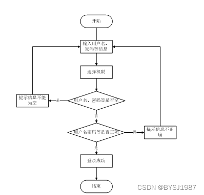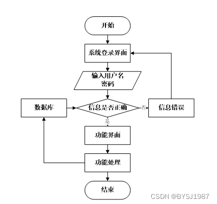 用户打开并进入系统后,会先显示登录界面,输入正确的用户名和密码,系统自动检测信息,若信息无误,则用户会进入系统功能界面,进行操作,否则会提示错误无法登录,操作流程如图3-3所示。