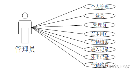 系统中的核心用户是系统管理员,管理员登录后,通过管理员菜单来管理后台系统。主要功能有:首页、人员管理、车辆档案、进入记录、外出记录、车辆收费、个人管理等功能。管理员用例如图3-7所示。