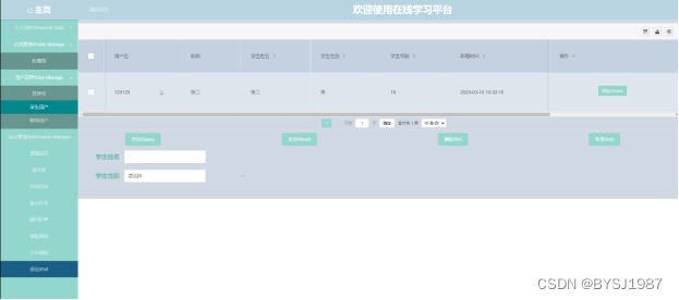 在线学习平台中的管理人员是可以对前台注册的学生用户以及教师用户进行管理的,也可以对管理员进行管控。界面如下图4-7所示。