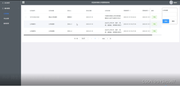 (2)公告管理:管理员可以发布公告表供教师/学生用户查看。