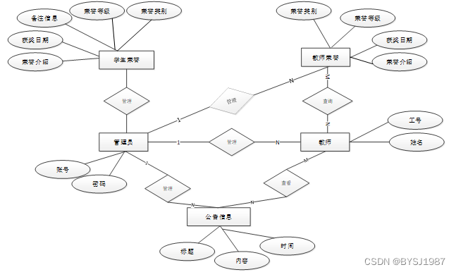 下面是整个师生荣誉管理系统中主要的数据库表总E-R实体关系图。