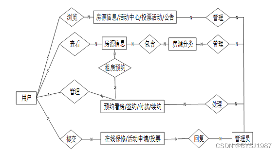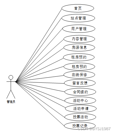 管理员角色的用例包括站点管理(轮播图、公告栏)用户管理(管理员、用户)、内容管理(资讯列表、资讯分类列表)、更多管理(房源信息、租房预约、合同签约、在线保修、留言反馈、合同续约、活动中心、活动申请、投票活动、投票记录。