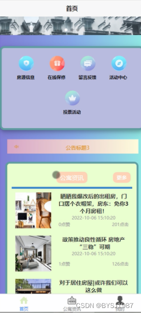 The main users of the apartment information service applet are divided into administrators and users. The implementation functions include administrators: site management (carousel map, bulletin board), user management (administrators, users), content management (information list, information classification list) More management (housing information, rental reservation, contract signing, online warranty, message feedback, contract renewal, activity center, activity application, voting activities, voting records, etc.). User homepage: housing information (appointment, likes, comments, collections), online warranty, message feedback, activity center (application, likes, comments, collections), voting activities (voting, likes, comments, collections), announcements; Apartment information; My: basic information, collection, rental appointment, contract signing, online warranty, message feedback, contract renewal, activity application, and voting records. Because the functional module design of this website is relatively comprehensive, the entire apartment information service applet information management process can be realized.