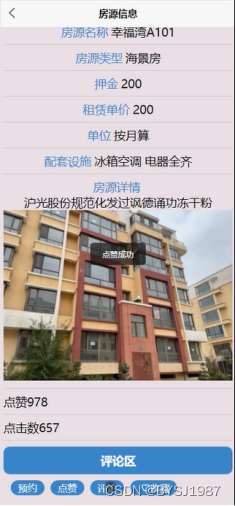 点击任意一个房源后将可以进入到该房源的详情界面中,它包括了房源名称+房源类型+类型+押金+租赁单价+单位、配套设施、详情等一系列的详细介绍,还可以预约、点赞、评论、收藏等,房源详情界面如下图4-5所示。