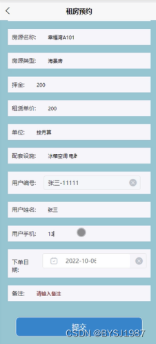 点击“预约”后进入到“租房预约”界面,输入联系方式+预约说明,点击“提交”按钮后将会生成自己的预约信息,预约界面如下图4-6所示。