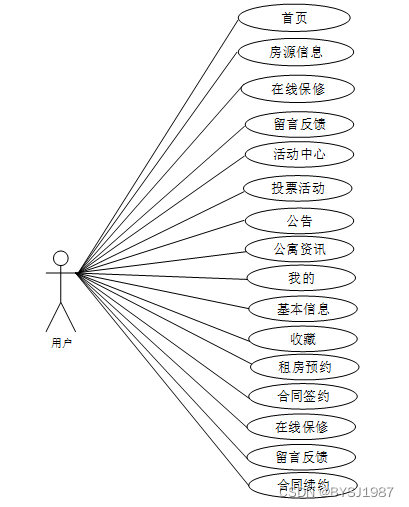 用户角色的用例包括首页:房源信息(预约、点赞、评论、收藏)、在线保修、留言反馈、活动中心(申请、点赞、评论、收藏)、投票活动(投票、点赞、评论、收藏)、公告;公寓资讯;我的:基本信息、收藏、租房预约、合同签约、在线保修、留言反馈、合同续约、活动申请、投票记录等。