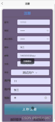 非用户可以通过微信小程序在线进行注册,填写上自己的账号、密码、确认密码、昵称、邮箱、手机等信息后点击“提交”按钮后将会验证是否有非空数据,再验证密码和重复密码是否一样,最后验证是否账号重复,都验证没问题后即可注册成功。注册实现了用户注册和发布者注册两部分,其用户注册界面展示如下图4-1所示。