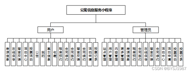 通过小程序的功能需求分析以及用例分析,得出了基于springboot框架的公寓信息服务小程序的功能模块图如图3-1所示。