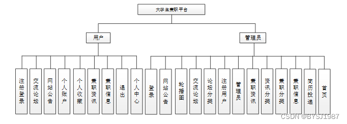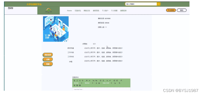 在本次大学生兼职平台中,利用了目前市场上普遍使用的Java技术,以及数据库管理功能MySQL,和目前比较流行的springboot框架,最后配合使用到了VUE页面布局技术进行系统界面的布置,以现实生活的用户运动过程为标准,设计实现了公告查询、资讯浏览、交流论坛、兼职信息、点赞收藏、在线评论等功能,并维护好后台的信息和整体系统的稳定性。
