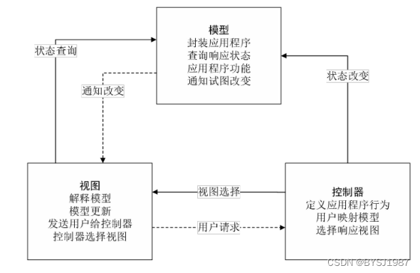 MVVM 就是将其中的View 的状态和行为抽象化,让我们将视图 UI 和业务逻辑分开。当然这些事 ViewModel 已经帮我们做了,它可以取出 Model 的数据同时帮忙处理 View 中由于需要展示内容而涉及的业务逻辑。它强制性的把应用程序的输入、输出和处理全部分开,将其分为三个核心部分,这三个部分分别有不同的功能。