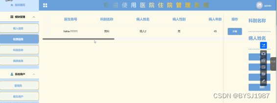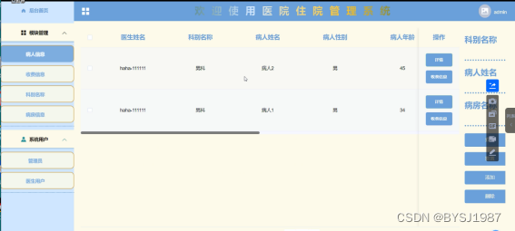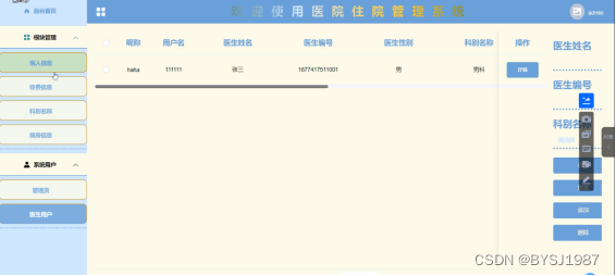 医院住院管理系统的设计与实现是为了让使用者更加方便的进行管理员工相关联的一些信息,使用者查找管理的时候能够节省大量的时间和精力,有效减少不必要的查找时间。系统在功能上划分为医生用户端和管理员端两大部分。