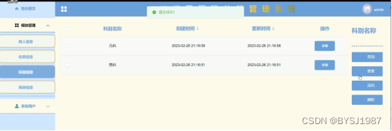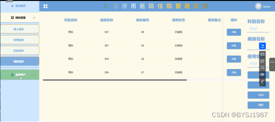 (3)病房信息:点击“病房信息”这个按钮可以查看到系统中所有的病房信息,支持通过科别名称或者病房名称或者病床编号进行查询病房信息,如果想要添加新的病房信息,点击“添加”按钮然后根据提示输入病房信息,点击“提交”后,在病房信息界面就会显示新增的病房信息,可以点击某一病房查看病房信息的详情,也可以直接点击“删除”进行删除病房信息;