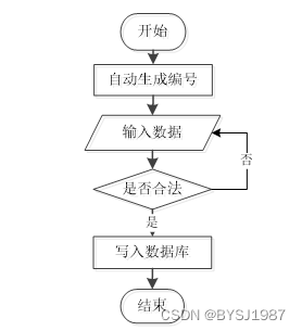 用户成功登入系统后就能够实现增加数据的操作,增加数据的编号是特定的,系统生成,用户不能随意填写,除了编号以外,其他增加信息用户自己填写,填写后的信息经过系统验证,验证合法通过就显示增加数据成功了,相反的话,就没有增加成功,图2-1显示的就是在增加数据时的流程。
