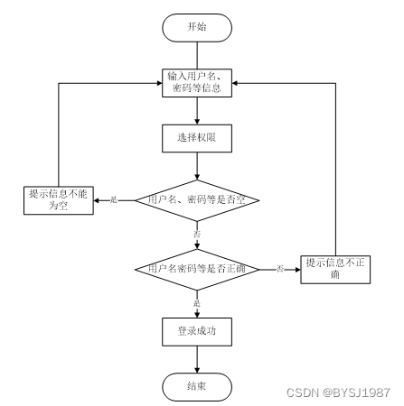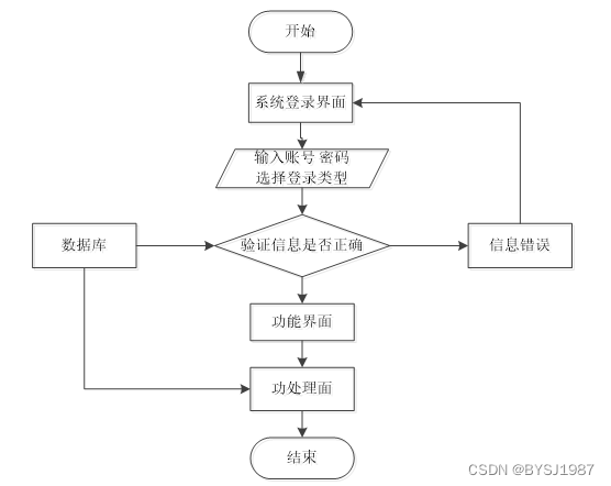 用户想进入系统,首先进入系统登录界面,通过正确的用户名、密码,选择登录类型登录,系统会检查登录信息,信息正确,然后输入相应的功能界面,提示信息错误,登录失败。系统操作流程如图3-4所示。