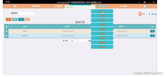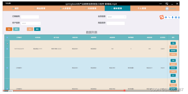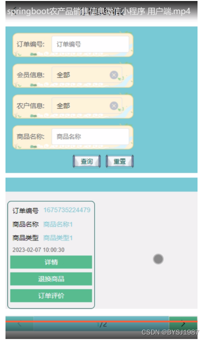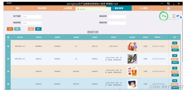 For the design of this agricultural product sales information system, it is mainly based on the use of java language and spring boot framework in the background. It is based on the dynamic programming of mysql database, WeChat applet and other technologies as well as the database for hard learning and a lot of practice, and applied to the construction of WeChat applet. In the design of the whole system, it is developed specifically according to the current situation of the online agricultural product sales information system, The network management of online agricultural product sales information system can be realized according to user needs. All kinds of information can be stored in an orderly manner. After entering the agricultural product sales information system page, the main control interface can be operated. The system functions include administrator server: home page Website management (rotation chart, announcement information) Personnel management (administrator, member user, farmer user) Content management (boutique information, information classification) Module management (preferential agricultural policy, course learning, farmer shopping mall, order information, logistics information, return and exchange goods, order evaluation, customer service consulting, commodity type) Personal management; User client: Home page, boutique information (order information, logistics information, return and exchange of goods, order evaluation, customer service consultation) and other functions.