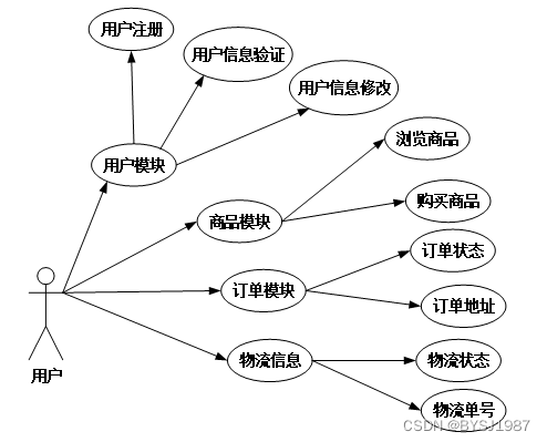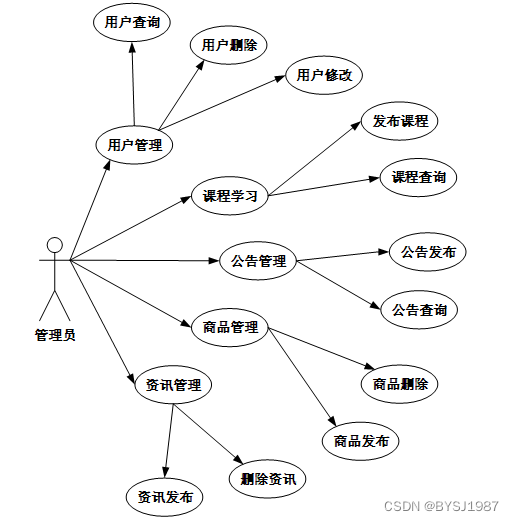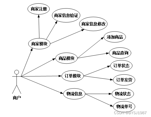 - 商户主要负责首页、模块管理(农户商城、订单信息、物流信息、退换商品、订单评价)个人管理、商家,下图所示描述管理员的用例图